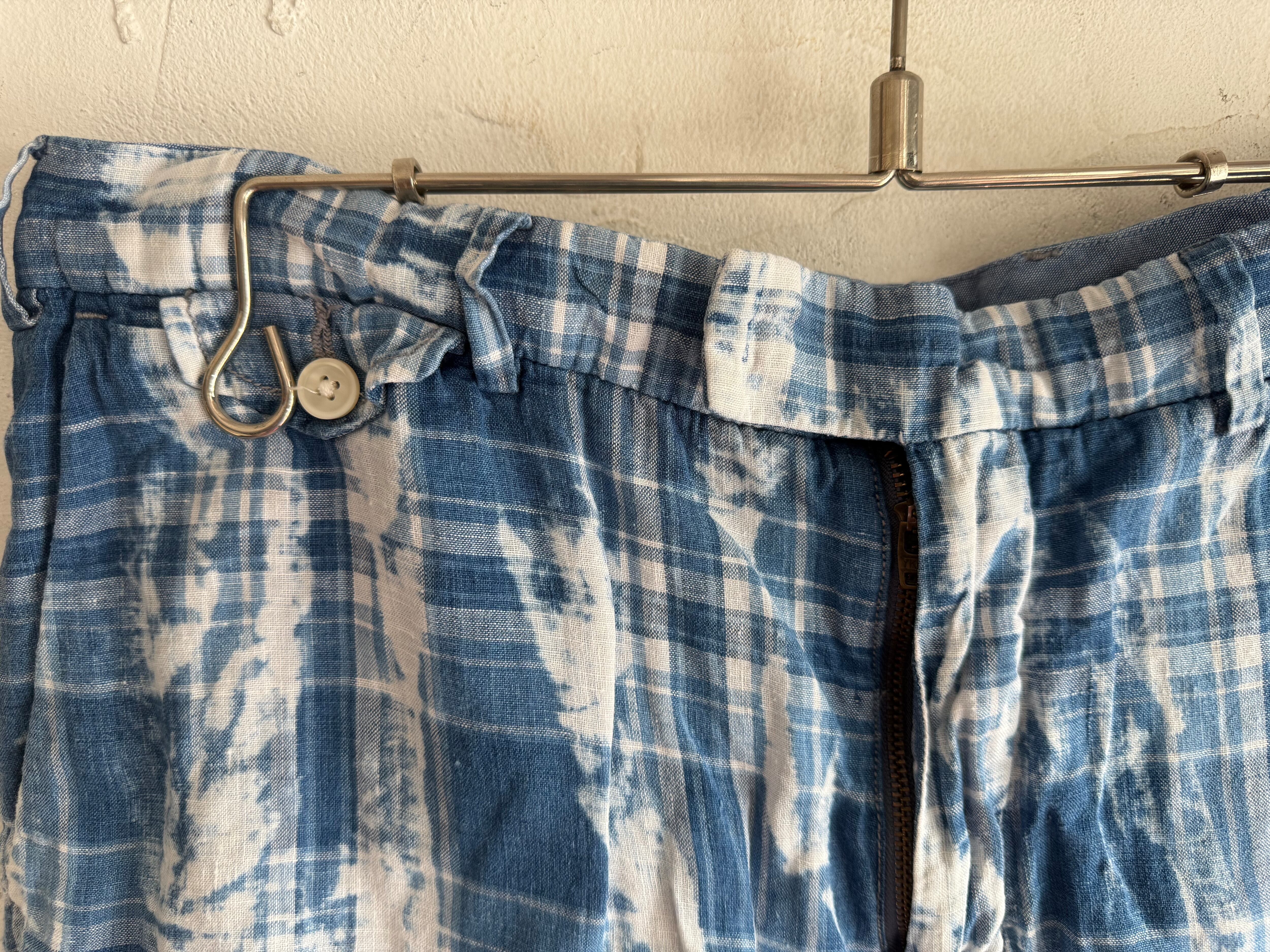 インド麻のマドラスチェックでブリーチ加工が施されたパンツ