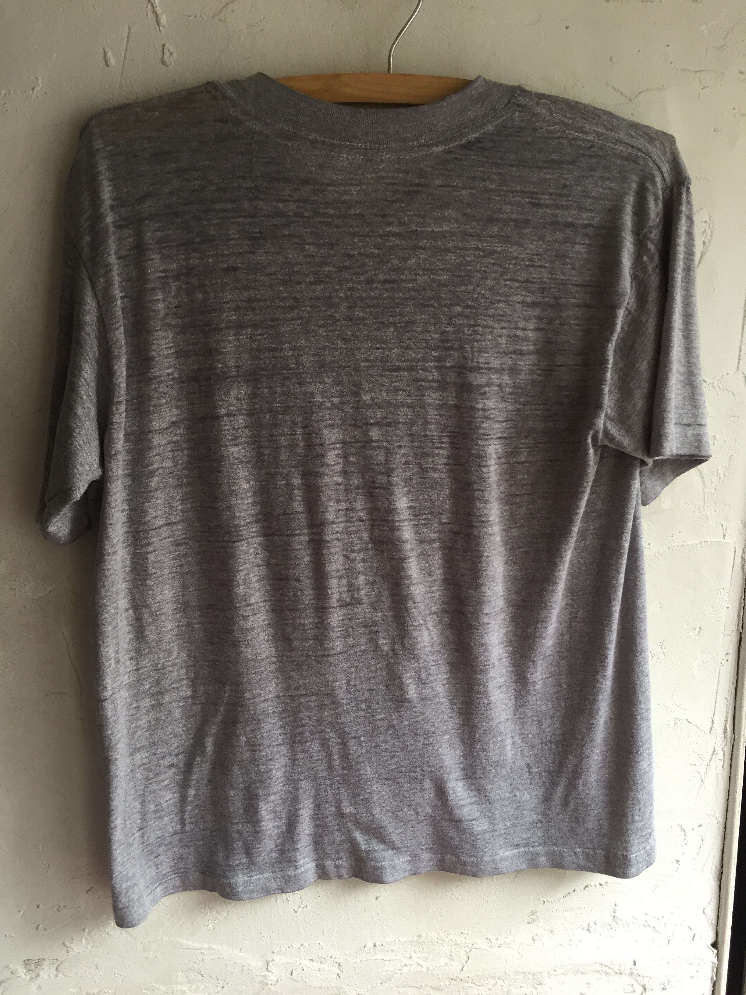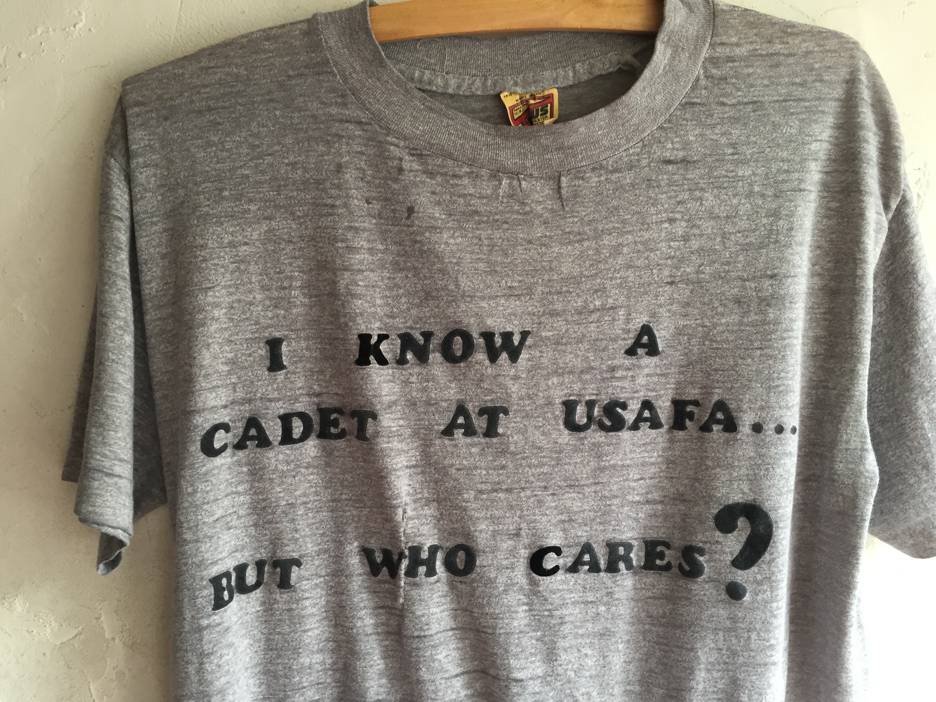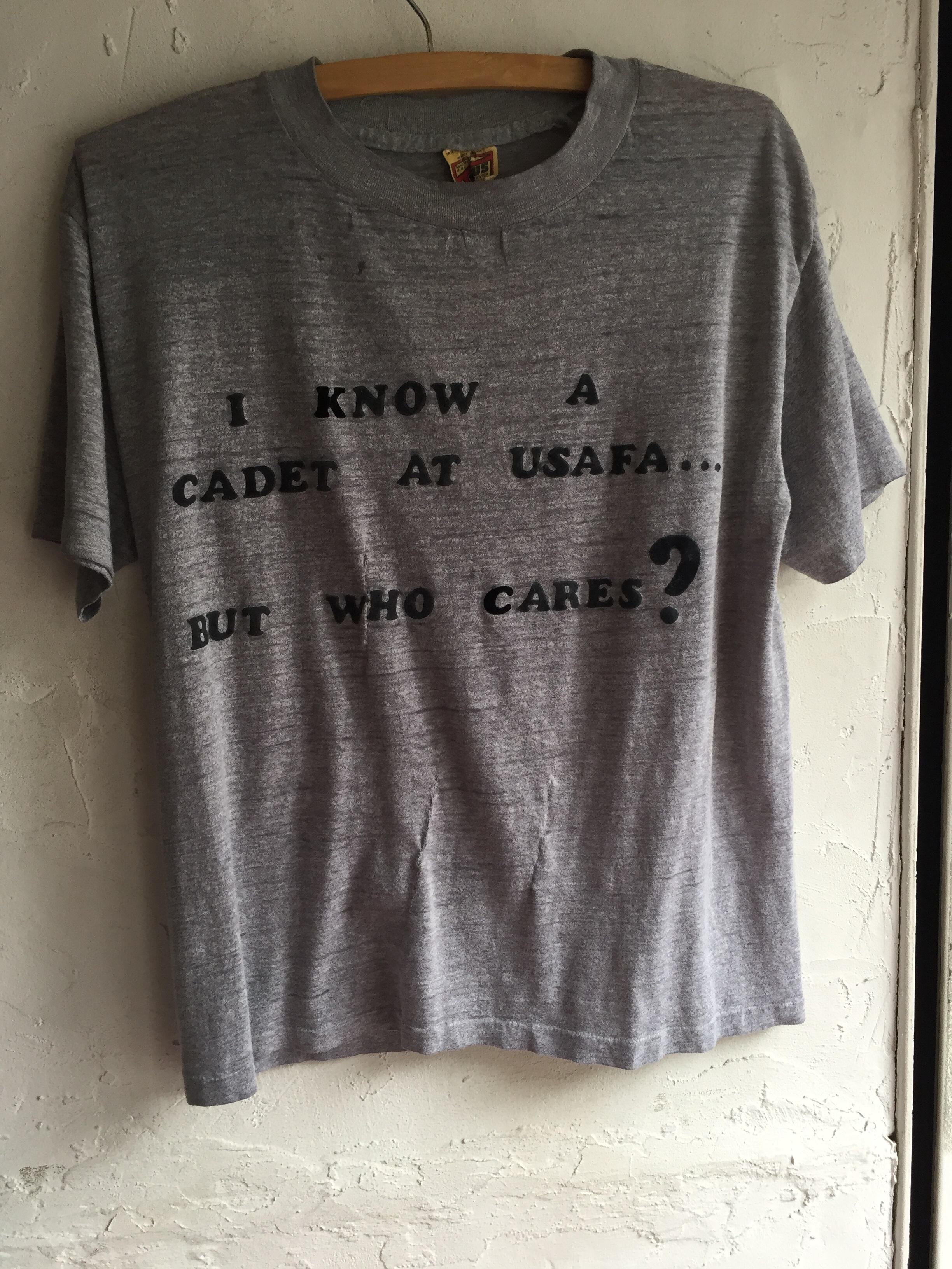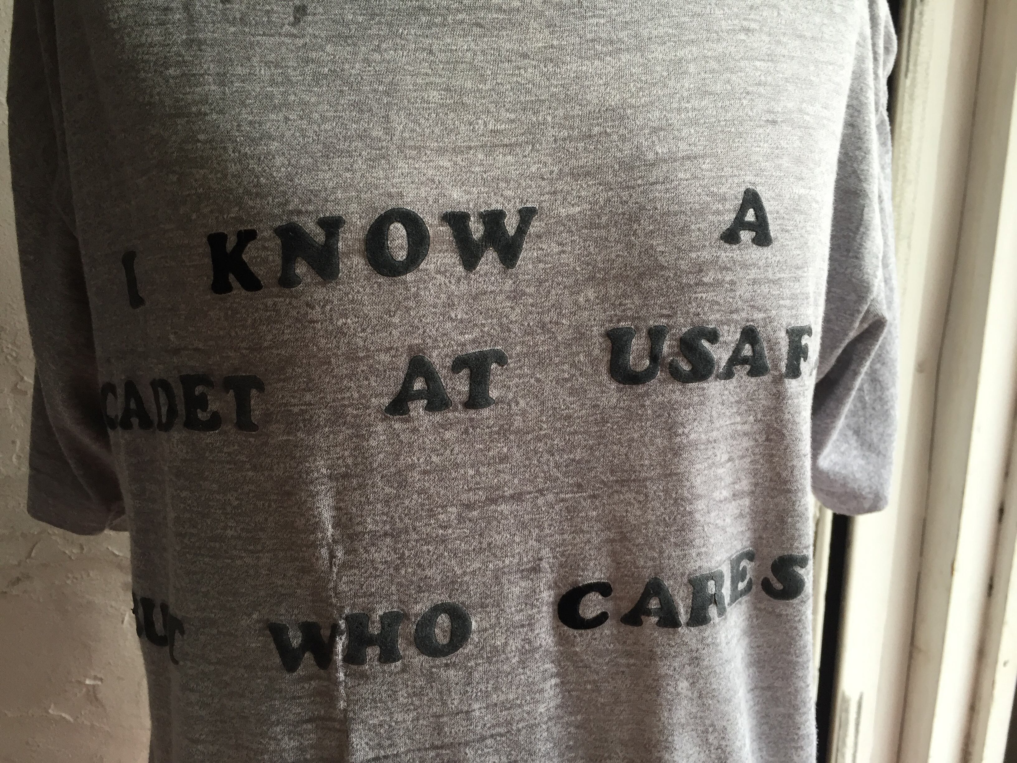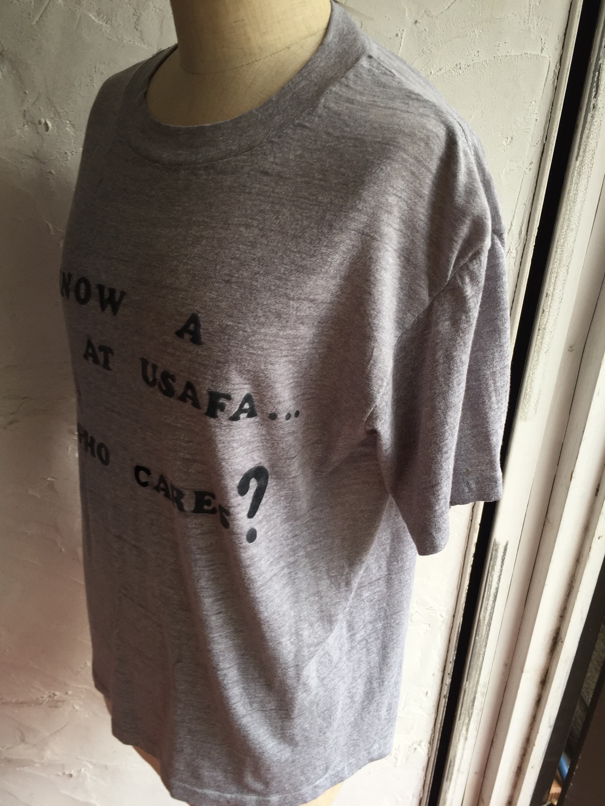 クタクタのボディーに軍物っぽいフェルトで文字がアップリケされたメッセージTシャツ