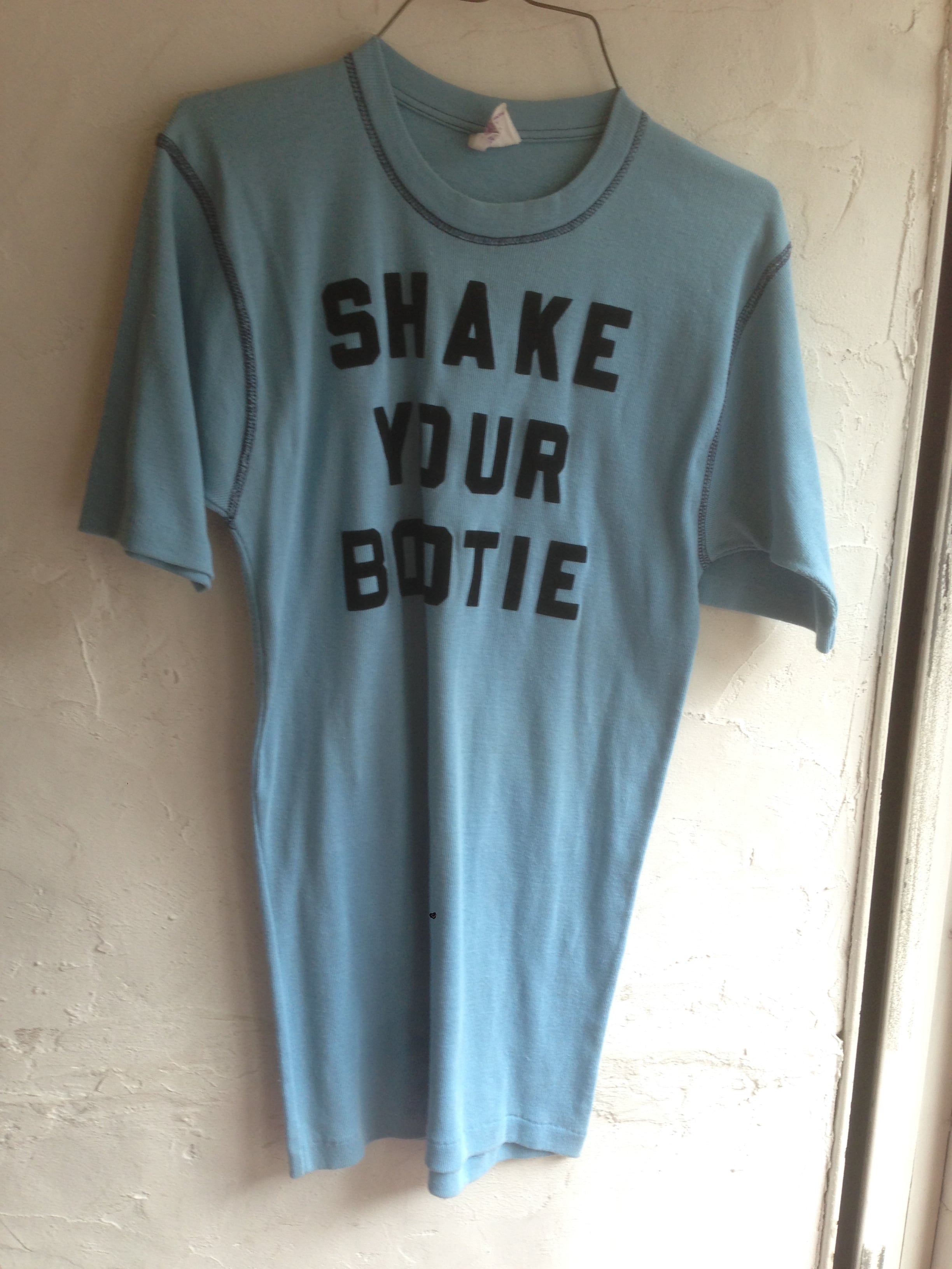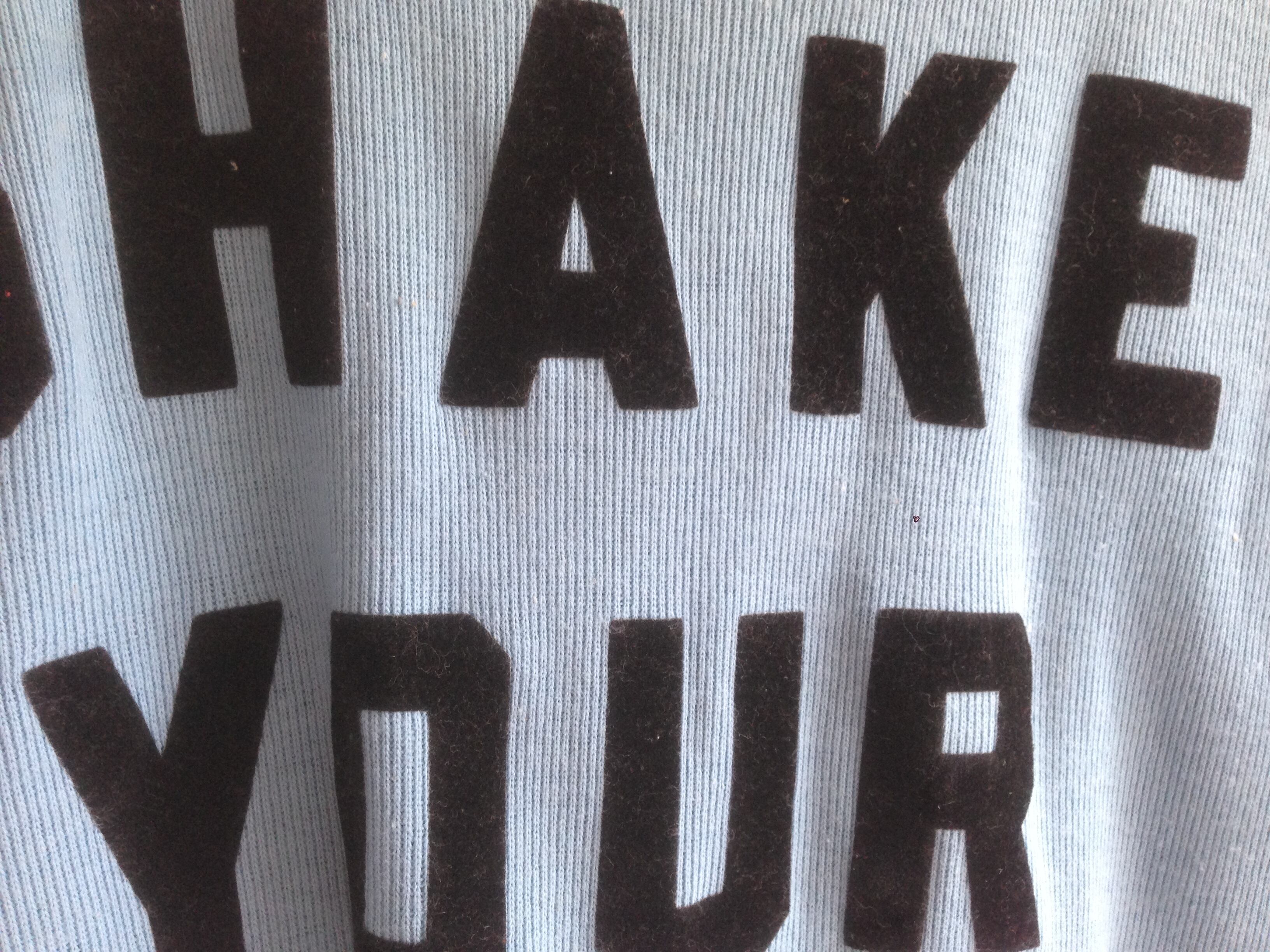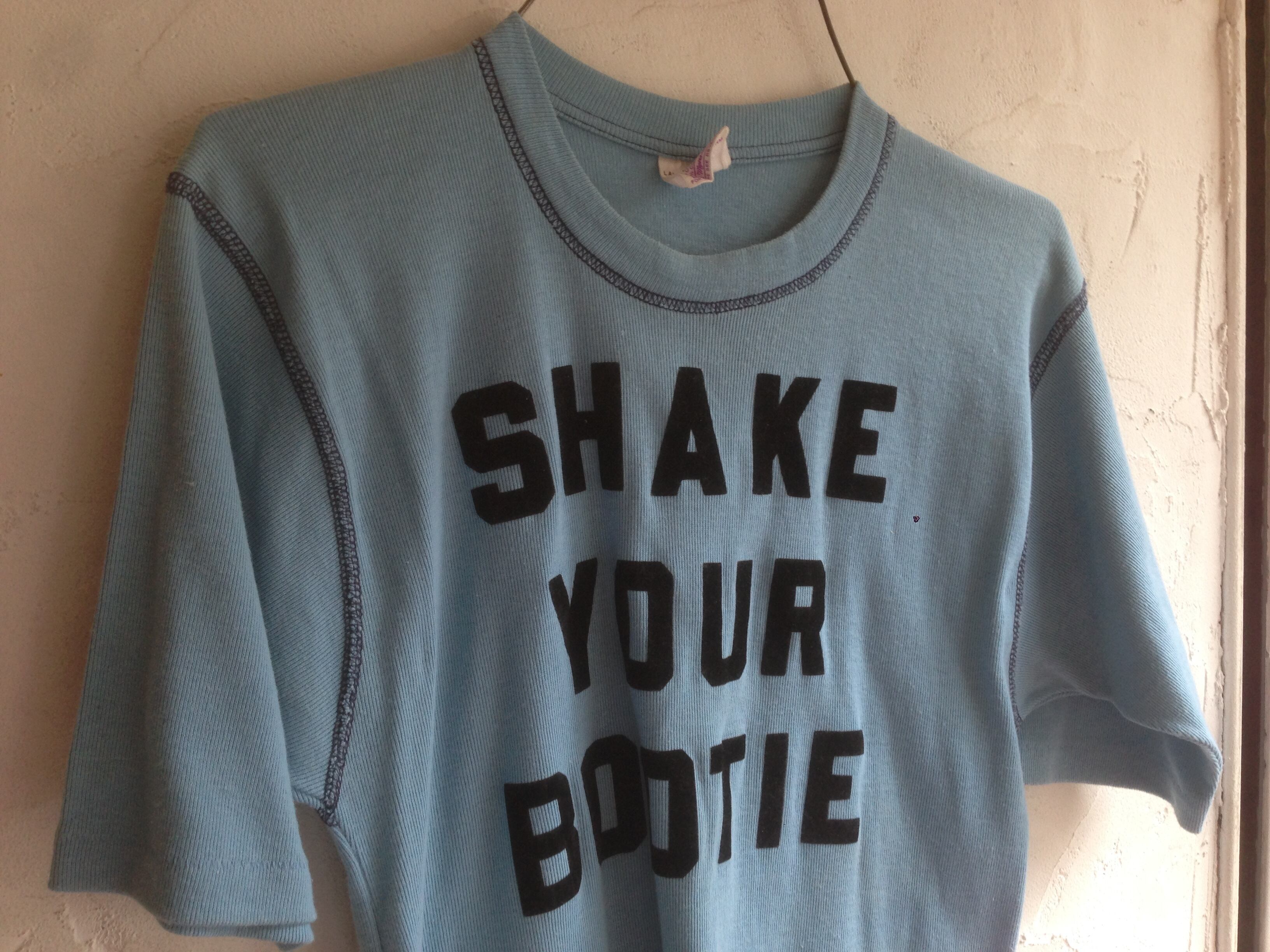 Shake your bootie というフエルト素材のメッセージのTシャツ