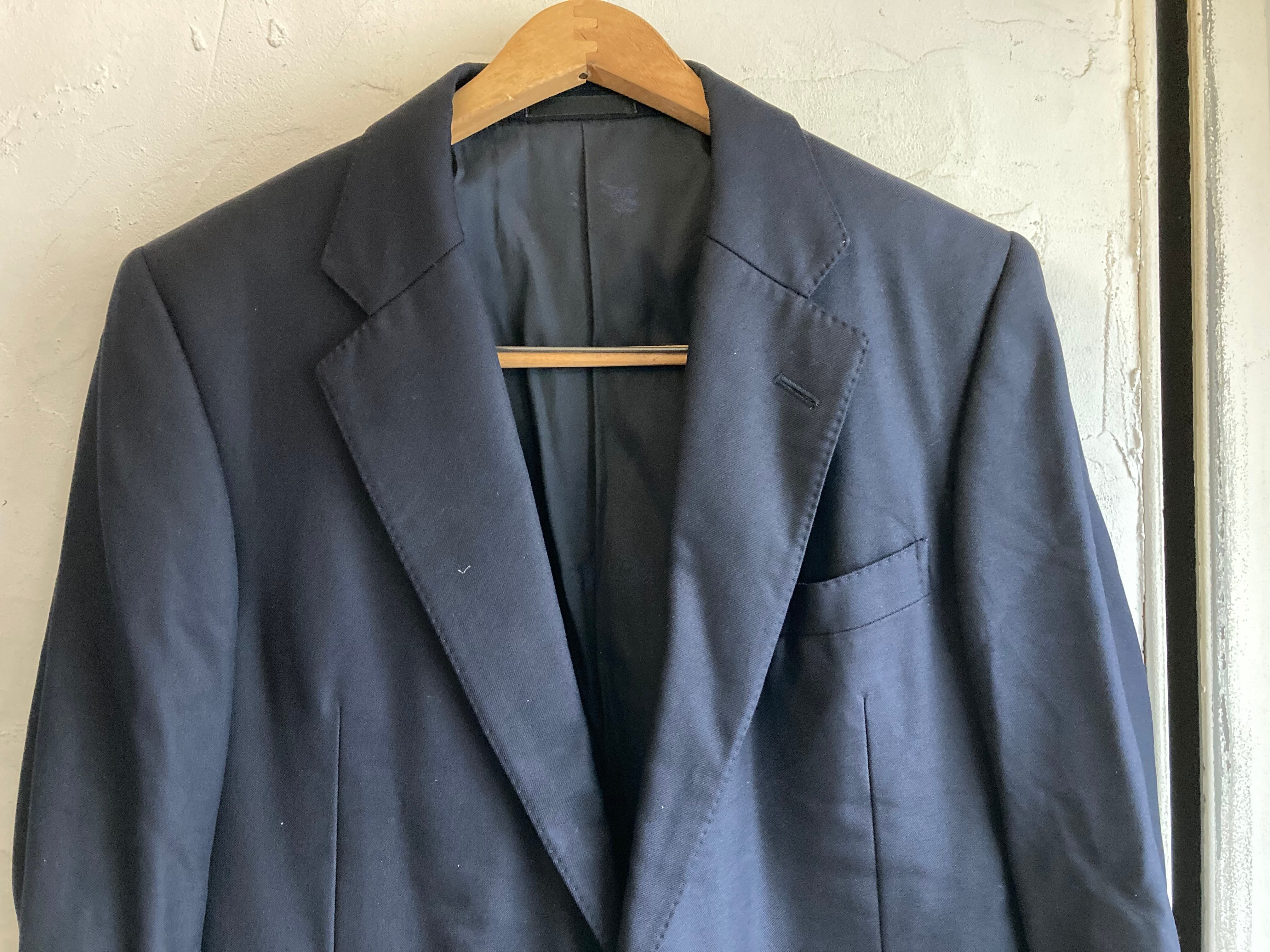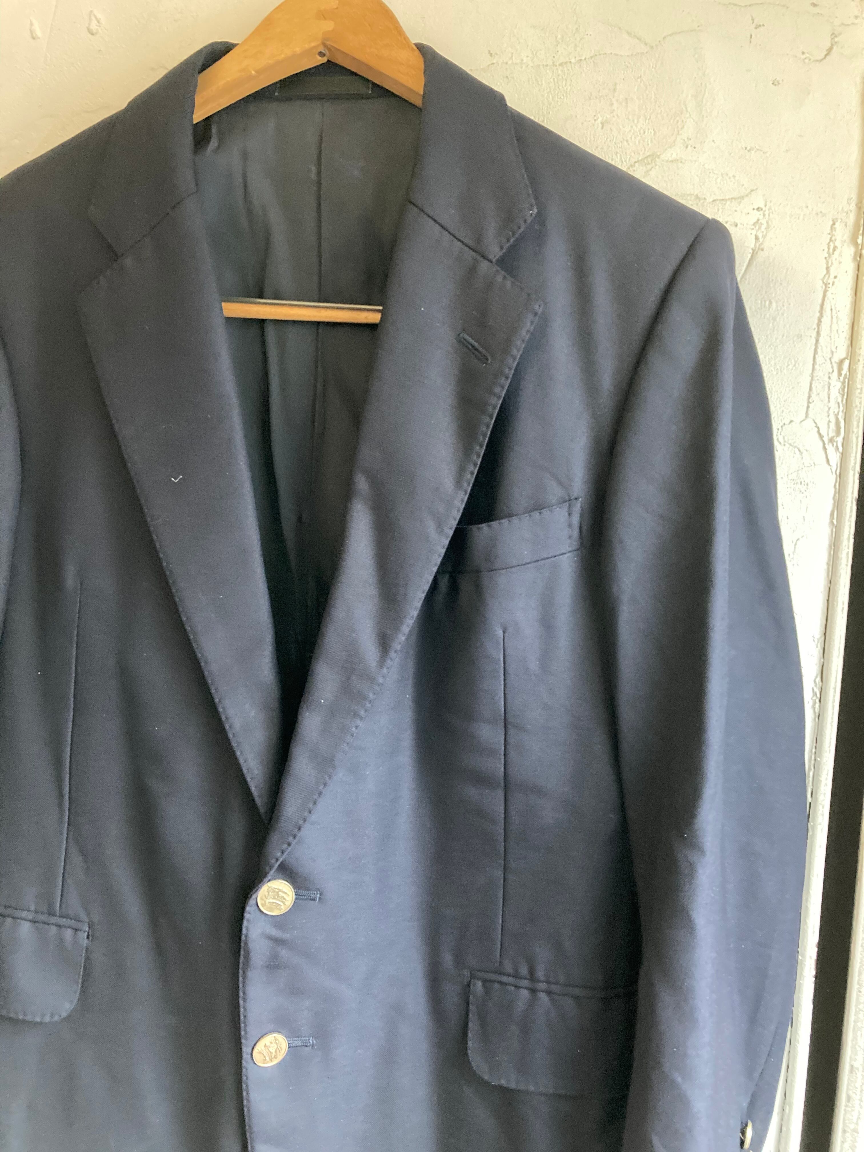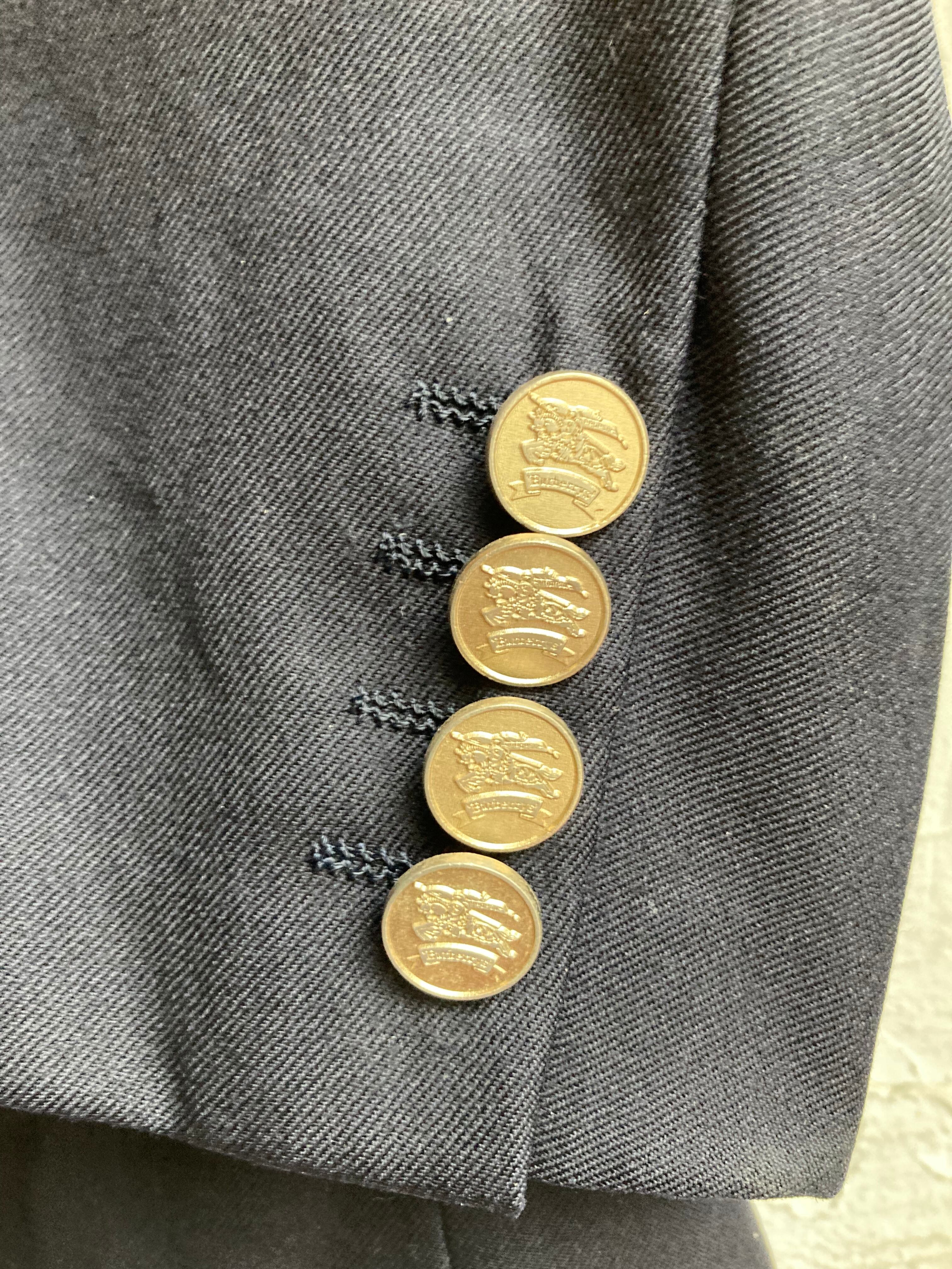 背抜き無しのタイプでサイドベンツあり、金ボタンにはバーバリーの刻印が入っています