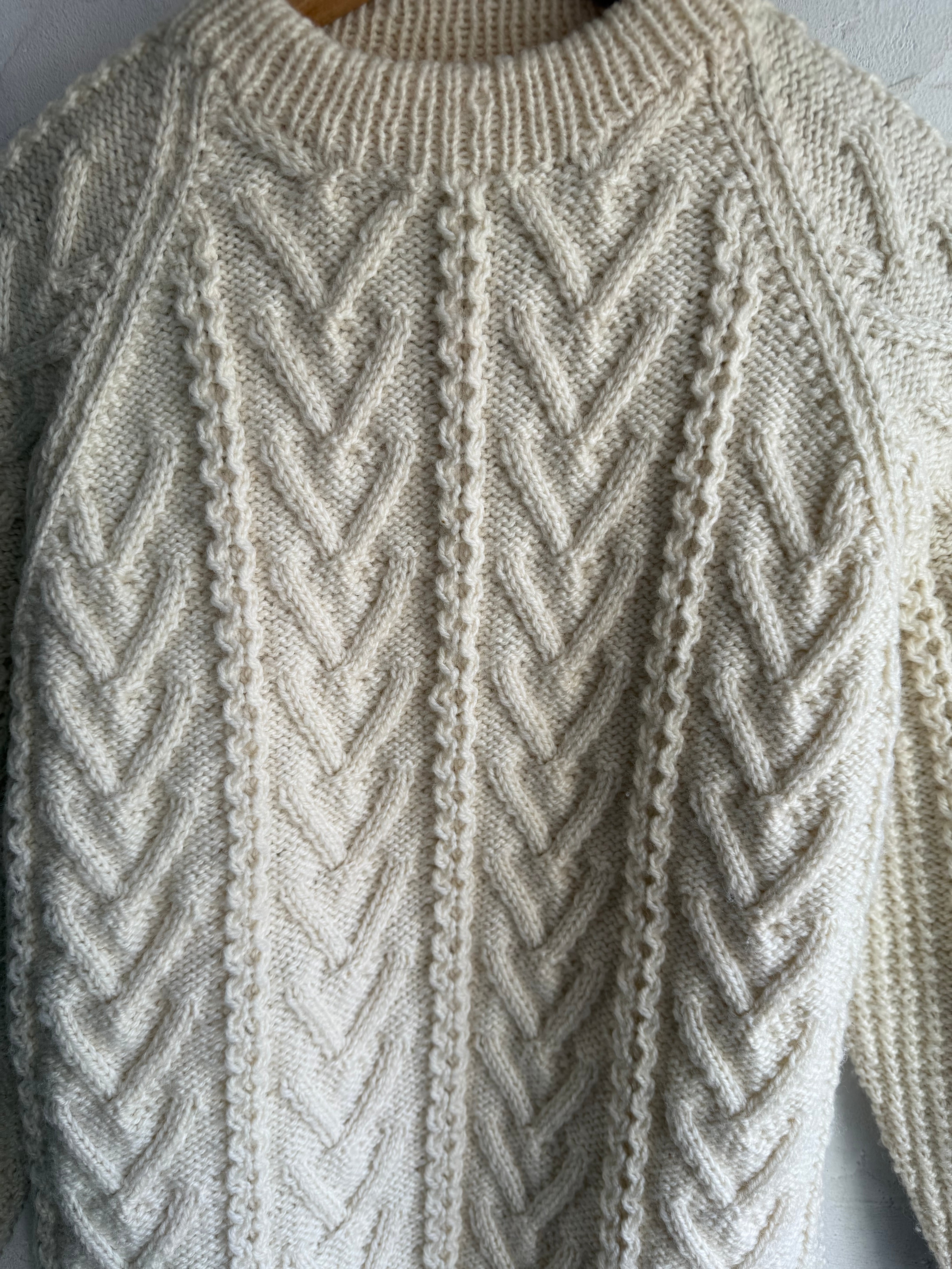 アイボリーのケーブルニットセーター、ラグランスリーブデザイン。